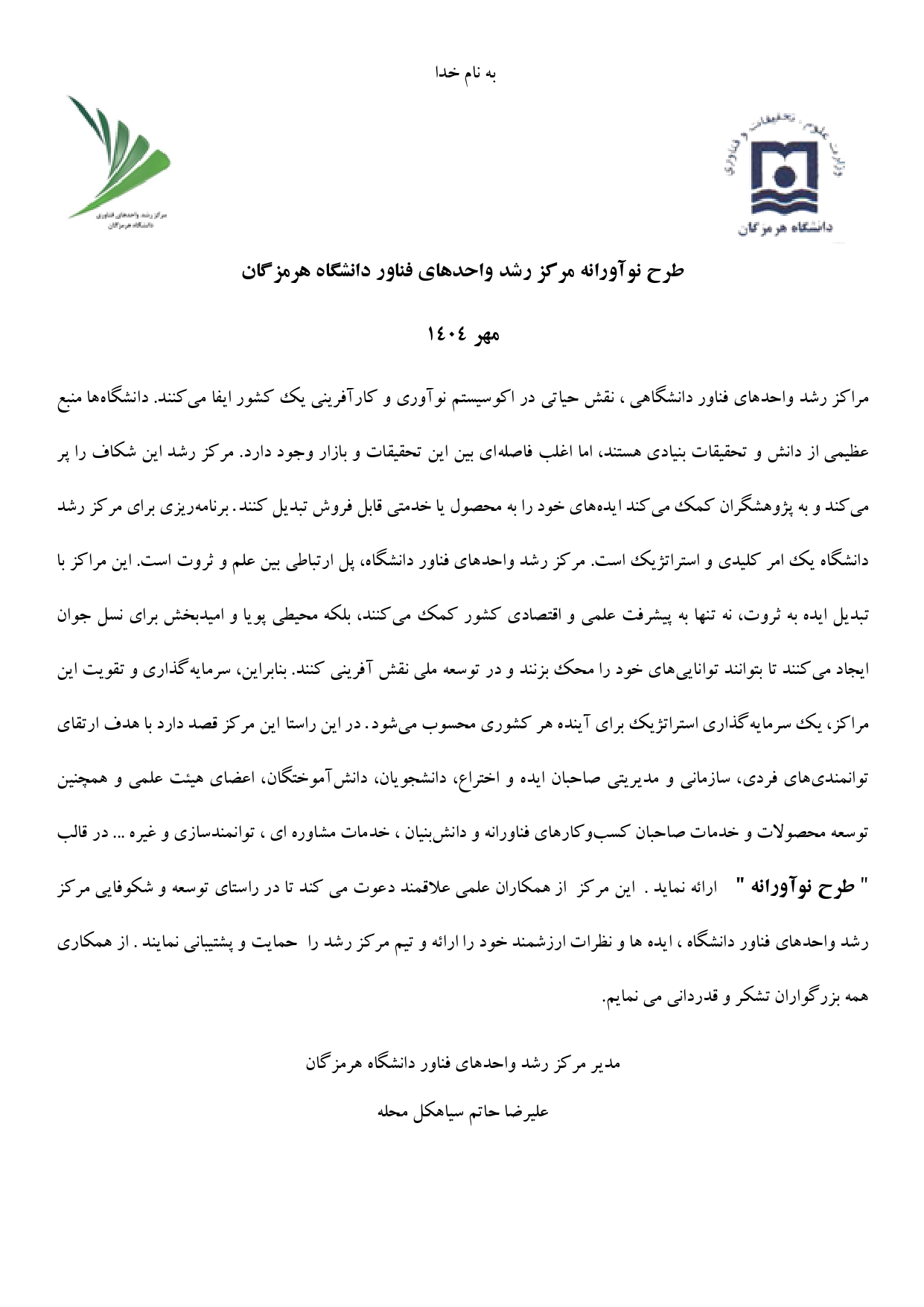 اجرای طرح نوآورانه مرکز رشد واحدهای فناور دانشگاه هرمزگان