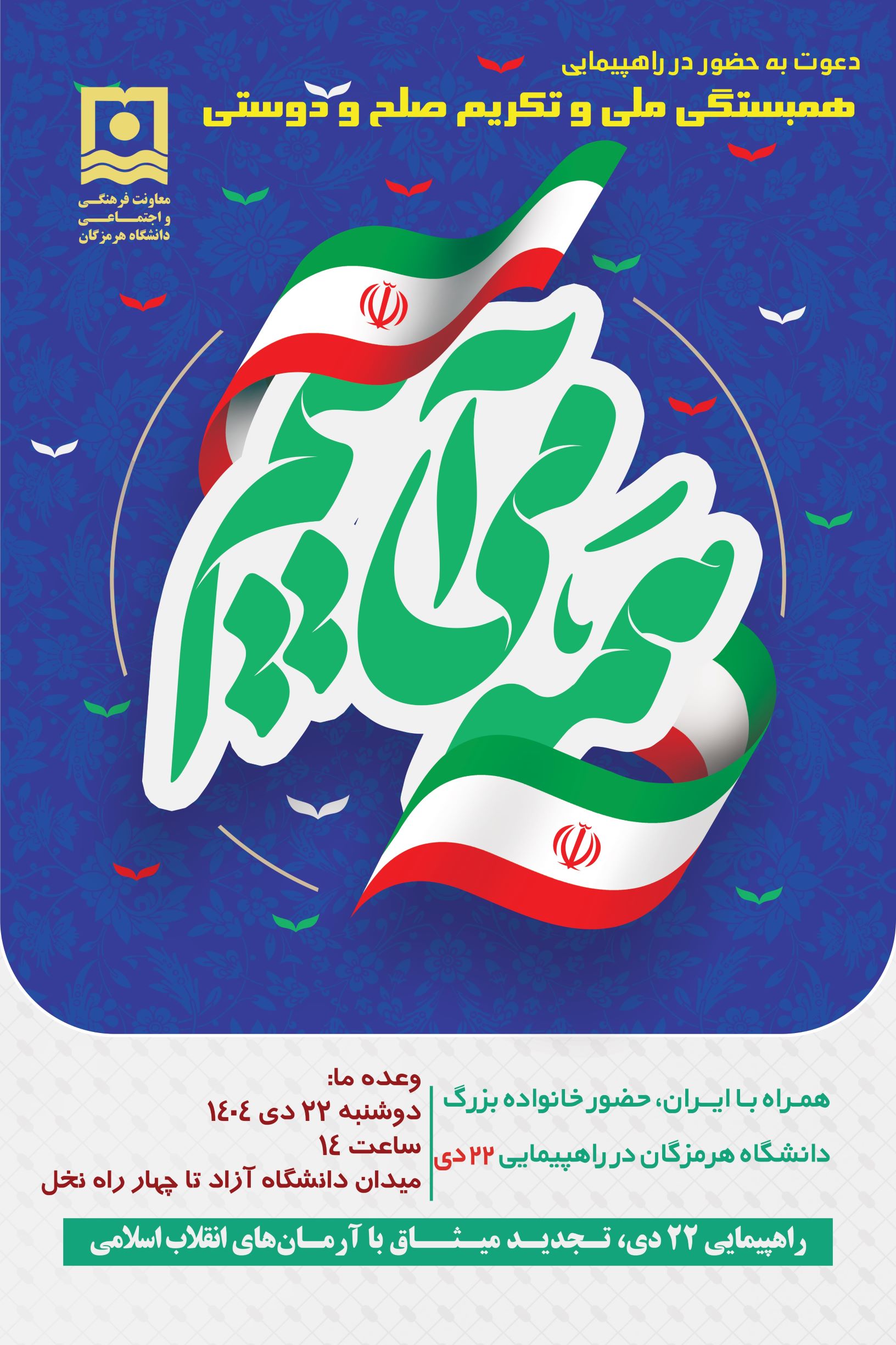 دعوت خانواده بزرگ دانشگاه هرمزگان برای حضور در راهپیمایی 22 دی: