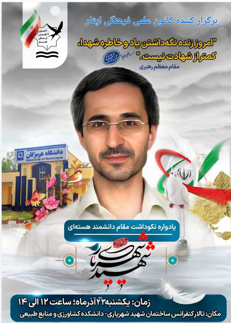 معاونت فرهنگی و اجتماعی با همکاری کانون علمی فرهنگی ایثار دانشگاه هرمزگان دومین یادواره نکوداشت مقام دانشمند هسته‌ای شهید دکتر مجید شهریاری را در روز یکشنبه مورخ 23 آذر 1404 در تالار اجتماعات دانشکده کشاورزی و منابع طبیعی برگزار می‌کند. لذا از همه شما فرهیختگان دعوت می‌شود تا در این مراسم که از ساعت 12 الی 14 ظهر برگزار خواهد شد، حضور به هم رسانید.