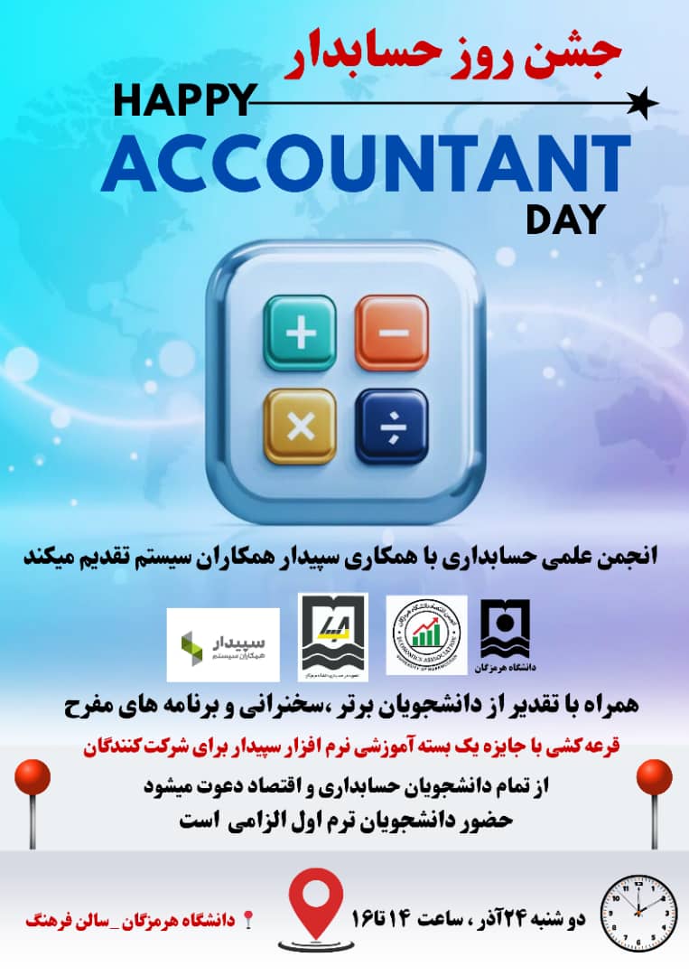 جشن گرامیداشت روز حسابدار همراه با تقدیر از دانشجویان برتر، سخنرانی، برنامه‌های شاد و قرعه‌کشی بسته آموزشی نرم‌افزار سپیدار، در دانشگاه هرمزگان برگزار می‌شود. این مراسم دوشنبه ۲۴ آذر در تالار فرهنگ دانشگاه برگزار خواهد شد.