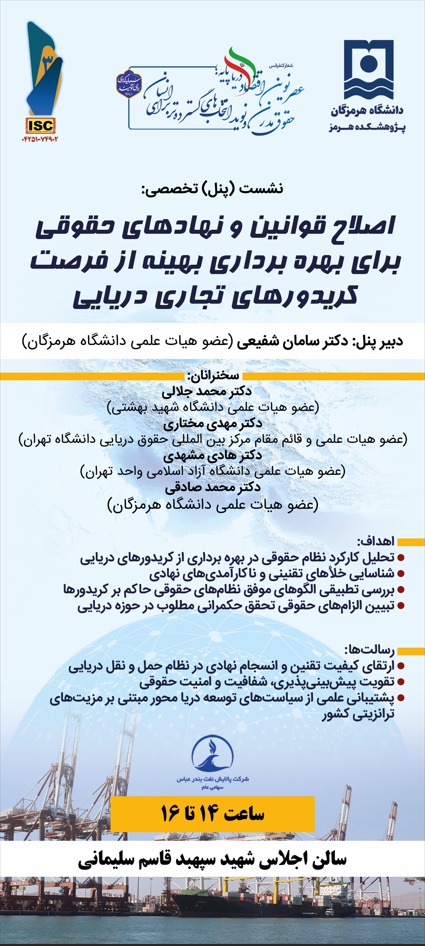 به اطلاع می رساند سومین کنفرانس بین المللی اقتصاد دریاپایه روز دوشنبه مورخ 27 بهمن 1404 در دانشگاه هرمزگان برگزار می گردد.سین، پنل تخصصی و  برنامه ارائه مقالات شفاهی سومین کنفرانس بین المللی اقتصاد دریاپایه به شرح زیر می‌ باشد: